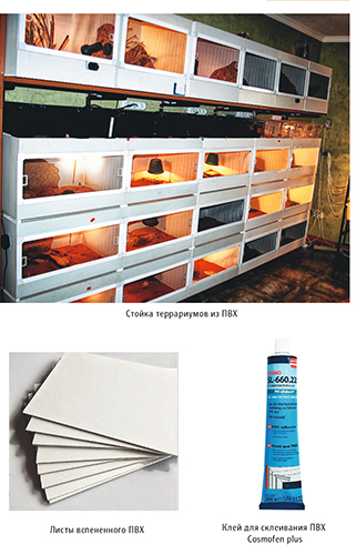 Важно, чтобы при определении для себя метода содержания своих питомцев любитель не исходил из соображений простоты или, еще хуже, лени. Сегодня на смену стеклу пришло большое количество материалов, которые отлично справляются с необходимыми требованиями для содержания большинства рептилий, при этом выполняя функцию биотопного террариума и минимизируя воздействие на животных внешних стрессовых факторов. Из всей линейки доступных материалов (оргстекло, стекло, ЛДСП, ОСП и ПВХ), на наш взгляд, хорошие террариумы получаются из листов вспененного ПВХ. Своих гекконов мы содержим именно в таких террариумах уже более 15 лет. В них хорошо живут и размножаются самые разные виды. Они достаточно прочные, легкие, хорошо составляются в блоки, экономя при этом площадь помещения, легко подвергаются обработке (мытье и дезинфекция) или доработке (сверление, установка дополнительного технического оборудования и т.п.), просты в обслуживании и мониторинге гекконов. Не используйте для изготовления террариумов ДСП (древесно-стружечные плиты), так как этот материал опасен для вашего здоровья и здоровья ваших питомцев. ДСП изготавливается на основе формальдегидной смолы, пары которой ядовиты.