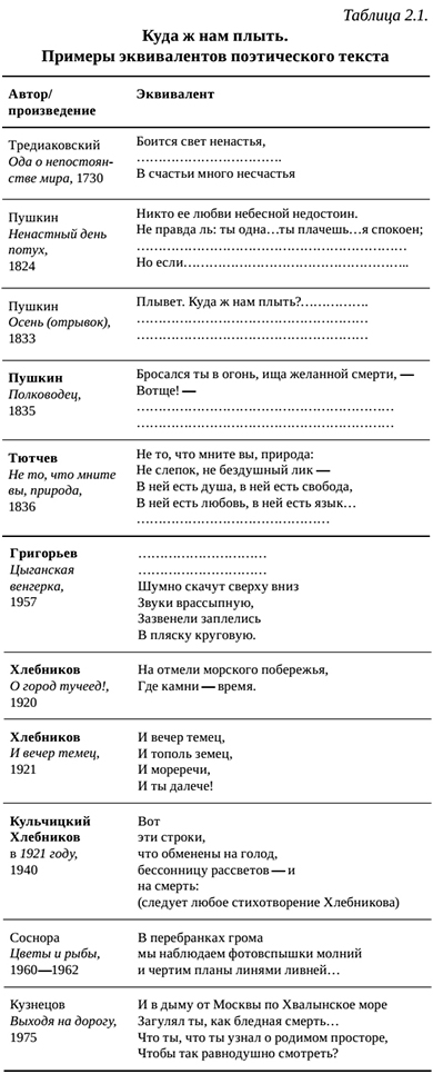 Отметим, что в ряде случаев минималистский текст может совпадать с эквивалентом поэтического текста. Например, строчки Пушкина «Куда ж на плыть?..» являются с одной стороны формой представления эквивалента текста (таблица 2.1), с другой стороны в силу своей художественности и афористичности вполне могут иметь самостоятельную семантическую значимость (табл. 2.2).