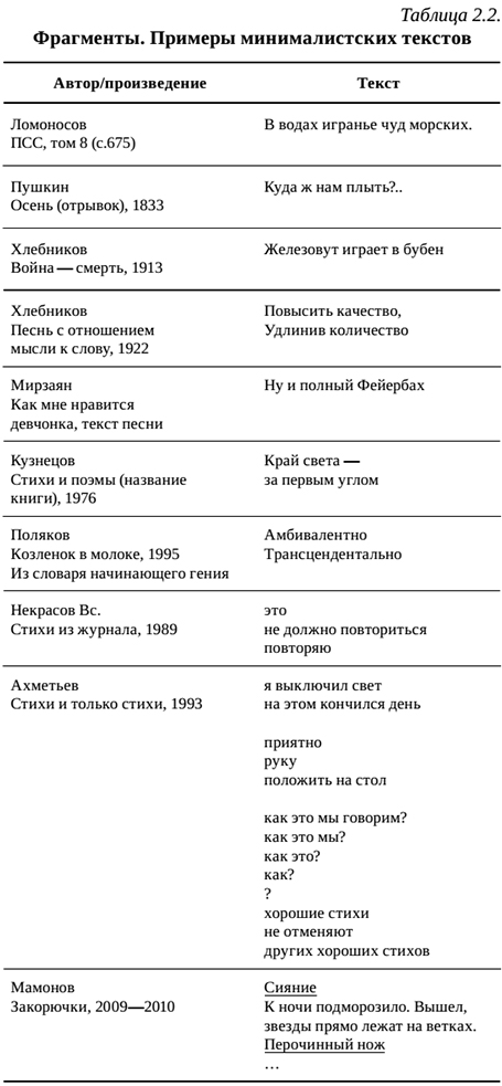 Удачные строчки, которые отчасти могут рассматриваться как самостоятельные произведения, встречаются у многих авторов. Начиная с восемнадцатого века, появляются поэтические произведения, состоящие из одной строки (Ломоносов, Карамзин, Хвостов). Значительный резонанс, в литературной среде, в свое время вызвал моностих Валерия Брюсова «О, закрой свои бледные ноги». Вместе с тем существуют авторы, которые преимущественно пишут стихи в жанре минималистской поэзии (Ахметьев, 1993, 2020). Приведем несколько примеров минималистских текстов (табл. 2.2), не вдаваясь особенно в историю вопроса.