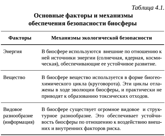 Биосфера как система с внутренне присущей безопасностьюСамообеспечение «безопасного» развития биосферы, сохранение ее живучести определяется рядом основополагающих факторов (табл. 4.1) (Алексеев, 1978; Алексеев, Гирусов, 1981; Крышев, Рязанцев, 2010):