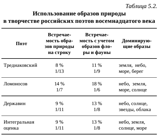 В стиховых текстах Тредиаковского встречаемость образов природы составляет около 8 %, в среднем один образ в каждой 13-й строке. У Ломоносова и Державина соответственно – в каждой 7-й и 11-й строке.