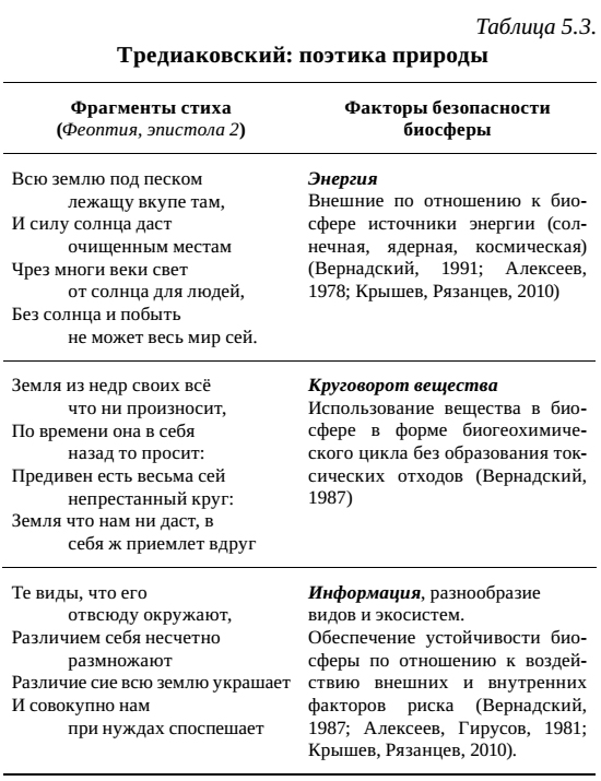 Остановимся более детально на вопросах поэтики природы (табл. 5.3). Отметим, поэтическую интуицию Тредиаковского, высказавшего принципиально важные экологические постулаты, значительно раньше публикации научных трудов об эволюции биосферы.