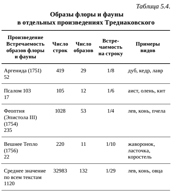 И как солнцевы кони, от сланных глубин востекая,Всюду разольют огнь лучезарный света дневного(Тилемахида, книга 4)В среднем образы флоры и фауны встречаются в стихах Тредиаковской в 3,4 % случаев (в каждой 29 строке). В отдельных произведениях происходит концентрирование, загущение биотической компоненты, наиболее сильно проявляющиеся в поэме «Феоптия» (эпистола 3) (табл. 5.4). По сравнению со средним уровнем встречаемость образов флоры и фауны в «Феоптии» (эпистола 3) возрастает в семь раз, в Псалме 103 в пять раз, в стихах из Аргениды в четыре раза, в оде «Вешнее Тепло» в три раза.