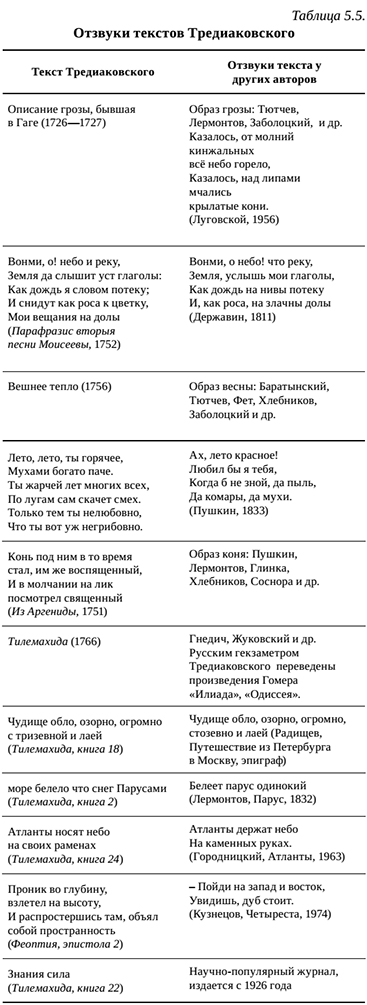 Важная особенность творческого наследия Тредиаковского: сохранение ряда созданных им текстов и образов в поэтической памяти, как современных ему авторов, так и последующих поколений поэтов (табл. 5.5).