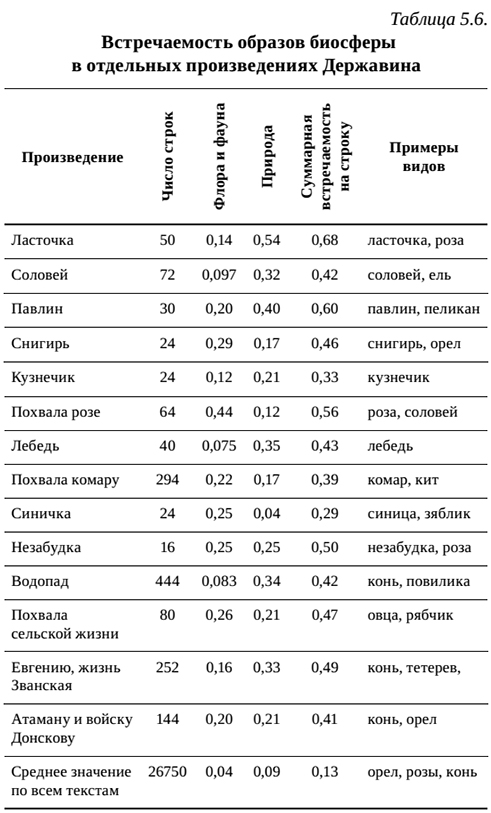 В микроскопе он, поверь,На ходулях дивий зверь;Хоботом – слону подобен;По крылам – дракон всем злобен;О шести ногах кулик;Тощ и мал, а льва тревожит;(Похвала комару, 1807)В ряде произведений происходит концентрирование образов биосферы (табл. 5.6), по сравнению со средним уровнем встречаемость образов флоры и фауны в них возрастает от 2 до 5 раз.