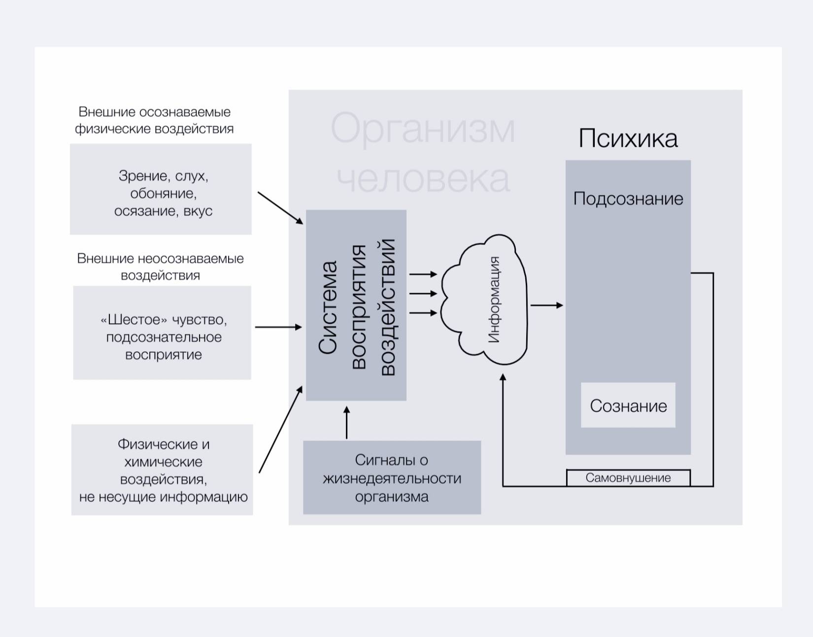 Не хочется погрязнуть в обсуждении о физиологическом функционировании живых систем, поэтому необходимо сделать разумный вывод о том, что от организма поступают сигналы, Психика превращает их в Информацию и использует в процессе обработки. Большая часть сигналов недоступна сознанию. Более подробно я не хочу углубляться, так как не имею медицинского образования. И, слава богу.
