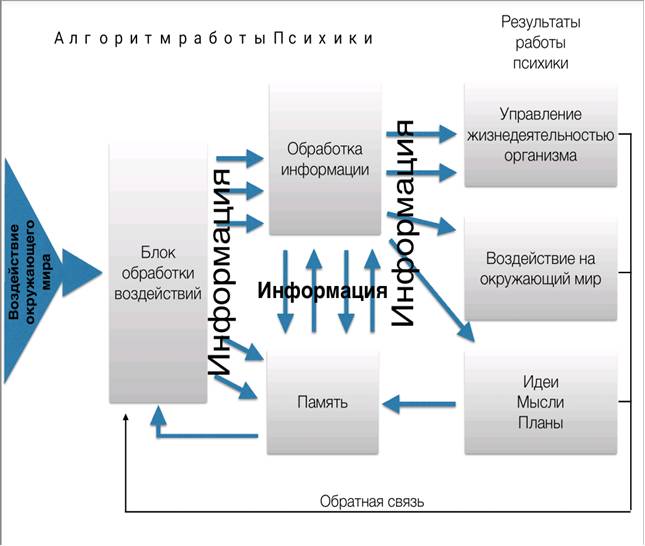 Внешний мир оказывает воздействие на Психику человека. Некоторую часть из непрерывного потока воздействий Психика преобразует в информацию. И теперь можем начать разбираться, как информация обрабатывается и что становится результатом работы Психики. Разумно будет вспомнить основные знания, которые мы будем использовать для анализа структуры Психики. Буквально конспективно позволю себе напомнить.