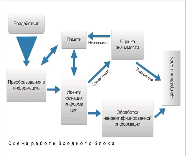 Резюме. Основная задача входного блока состоит в том, чтобы преобразовать воздействия в Информацию и идентифицировать ее. Подготовленная информация во входном блоке обработки направляется в Центральный блок обработки.