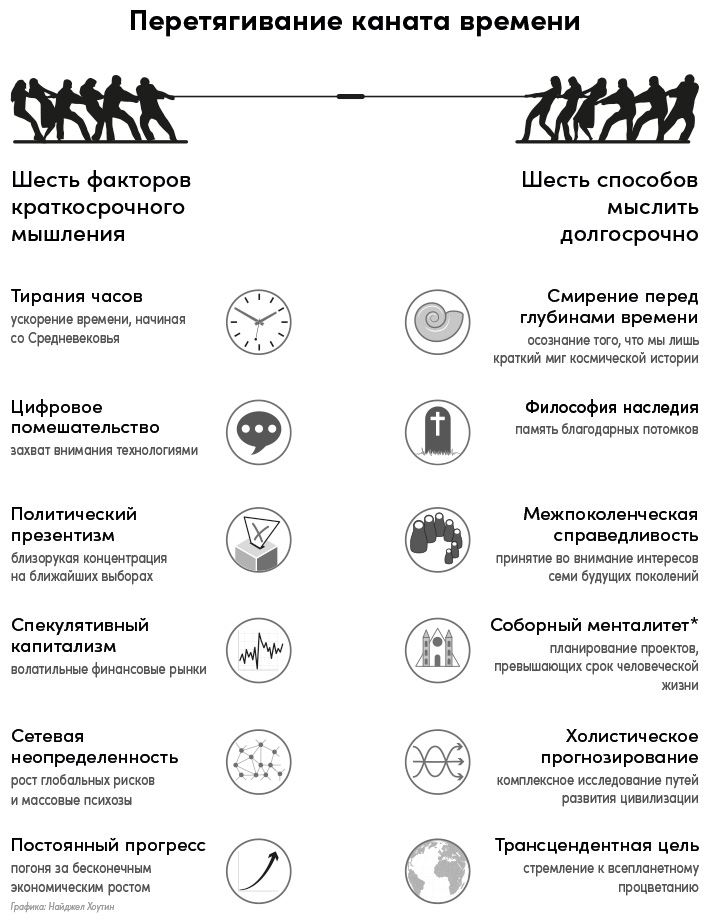 Хотя факторы нашей недальновидности, которые будут всплывать на протяжении всей книги, представляют серьезную силу, это еще не гарантирует им победы в перетягивании каната времени. Вопреки распространенному мнению долгосрочное мышление является одной из величайших способностей нашего вида, до сих пор остававшейся в тени. Мы думаем не только быстро и медленно, как это показал Дэниел Канеман, но также краткосрочно и долгосрочно. В наш мозг вшита способность думать и планировать далеко вперед. Эта способность сделала возможными многие грандиозные проекты: строительство лондонской канализации после Великого зловония 1858 г., программу государственных инвестиций «Новый курс» Франклина Рузвельта, самоотверженную борьбу против рабства и за права женщин и т. д. В дальнейшем мы убедимся, что именно этот секретный эволюционный ингредиент придает шести способам долгосрочного мышления потенциал и силу.