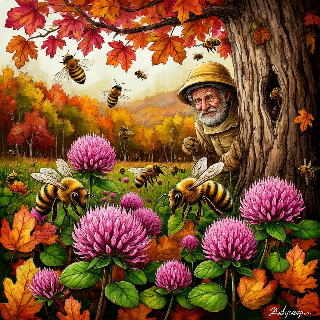 И там, в этой каменной колыбели, он увидел чудо. Небольшая поляна, размером с комнату, была устлана ковром из цветущего клевера. Его сиреневые и розовые головки, маленькие и нежные, пылали на фоне рыжей осенней травы, словно последние угольки в потухающем камине. Камни держали тепло – и поэтому тут задержался клевер – редкое, почти магическое явление. Воздух над этим клочком лета гудел и вибрировал от работы трудолюбивых тел. Пчёлы сновали туда-сюда, игнорируя приближение зимы, занятые своим последним, самым важным делом года. Смешанный запах цветочного нектара, нагретого камня и горьковатой осенней грусти был опьяняющим.