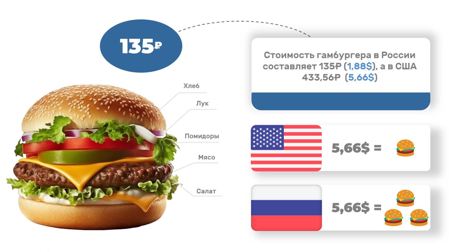 Но наиболее интересный показатель – ВВП по паритету покупательной способности. При помощи «паритета покупательной способности» сопоставляют цены на аналогичные товары и услуги в одной валюте. Это сравнение дает представление о том, насколько отличается стоимость жизни в разных государствах. Чтобы лучше понять, сравним этот показатель на примере цены на гамбургер в двух странах, т. к. он включает в себя базовые продукты из потребительской корзины (хлеб, мясо, помидоры, салат, лук). Если гамбургер в России стоит в среднем 135 руб., что в марте 2023 г. в мировой валюте равно 1,88$, то в Америке его стоимость равна 5,66$. Получается, что за одинаковое количество долларов в России можно купить в 3 раза больше гамбургеров, чем в США.
