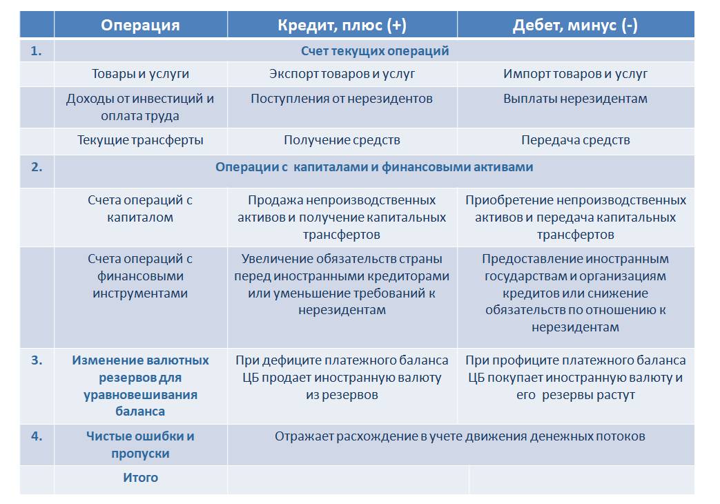 Платежный баланс представляет собой статистический документ о внешнеэкономической деятельности страны, где операции между резидентами и нерезидентами записываются в двух колонках: кредит и дебет. В кредит (со знаком плюс) заносят валютные поступления в страну от экспортируемых товаров и услуг, приход капиталов в виде инвестиций, даже дивиденды, выплачиваемые стране за размещение ее капиталов в другой стране, денежные переводы резидентов и т. д. В дебете (со знаком минус) указываются расходы страны в валюте за импортируемые товары и услуги и другие оттоки капиталов из страны, например, на инвестиции в иностранные компании или вложения в долговые бумаги других государств и т. д.