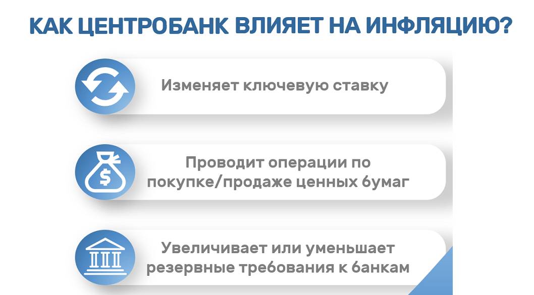 Ещё одной важной функцией ЦБ является регулирование инфляции. Инфляция – это устойчивый рост цен на товары повседневного спроса, промышленную продукцию и услуги, т. е. процесс снижения платежеспособности денег. На одну и ту же сумму через определённое время потребитель может купить из‑за инфляции меньше товаров.