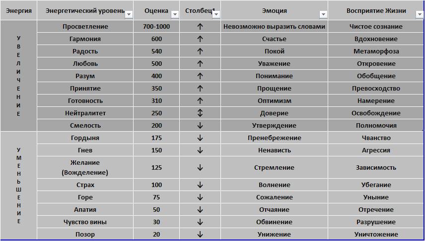 Таблица 1. Шкала эмоций (Карта сознания Дэвида Хокинса)