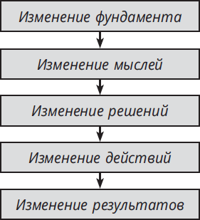 Человек не в состоянии распознать причину, почему к нему приходит та или иная мысль: сейчас я хочу посмотреть сериал или прочитать книгу? Но если вы осознанно воздействуете на первопричину зарождения мыслей в голове – ваше мировоззрение и образ восприятия действительности (этот уровень я называю фундамент), то это влияет на все последующие уровни. Стоит поменять фундамент, как у вас изменятся мысли, на основании новых мыслей у вас возникнут новые более качественные решения. Другие решения активируют систему новых действий, которые приведут вас к другому результату. Именно поэтому процесс любых изменений в жизни начинается с трансформации базовых принципов и устоев, на которых живет человек.
