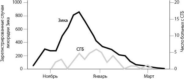 На острове Яп вирус Зика скорее вызывал любопытство, чем воспринимался как серьезная угроза. У многих людей наблюдались лихорадка и сыпь, но госпитализировать никого не пришлось. Ситуация изменилась, когда в конце 2013 года вирус пришел на более крупные острова Французской Полинезии. Во время вспышки в главную городскую больницу Папеэте на северном побережье Таити попали 42 человека с синдромом Гийена – Барре. Случаи СГБ стали регистрироваться несколько позднее, чем началась вспышка лихорадки Зика, что соответствовало нашим ожиданиям: синдром проявляется через пару недель после заражения. Гипотеза о возможной связи с вирусом подтвердилась, когда местная исследовательница Ван-Маи Као-Лормо и ее коллеги выяснили, что почти все пациенты с СГБ недавно были инфицированы вирусом Зика[48].