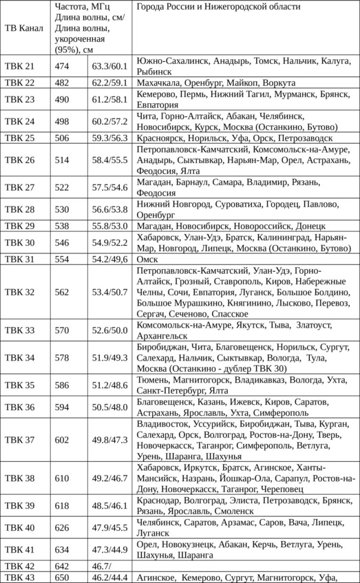 – Сводная таблица распределения цифровых телевизионных каналов ТВК 21 – ТВК 60 по основным городам России и Нижегородской области, по состоянию на 01.04.2025, с рассчитанной длиной волны в см., с учетом укорочения 95%,