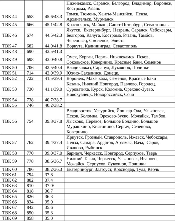Таблица территориального распределения цифровых телевизионных каналов в России и в Нижегородской области приведена ниже.