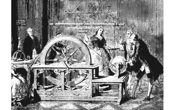 В 1746 г. аббат Жан-Антуан Нолле, французский физик, построивший электрическую машину в 1740 г. (см.), разрядил лейденскую банку перед французским королем Людовиком XV, пропустив при этом ток разряда через цепь из 180 королевских гвардейцев. В другой демонстрации аббат Нолле использовал железную проволоку, которой он соединил в один ряд длиной более километра монахов картезианцев, одетых в белые одежды. Когда через эту живую цепь аббат Нолле произвел разряд заряженной лейденской банки, то все монахи одновременно подпрыгнули в воздух. Видимо, этот синхронный прыжок был вызван ударом тока, потекшего через подопытных монахов из общей цепи на землю через ноги.