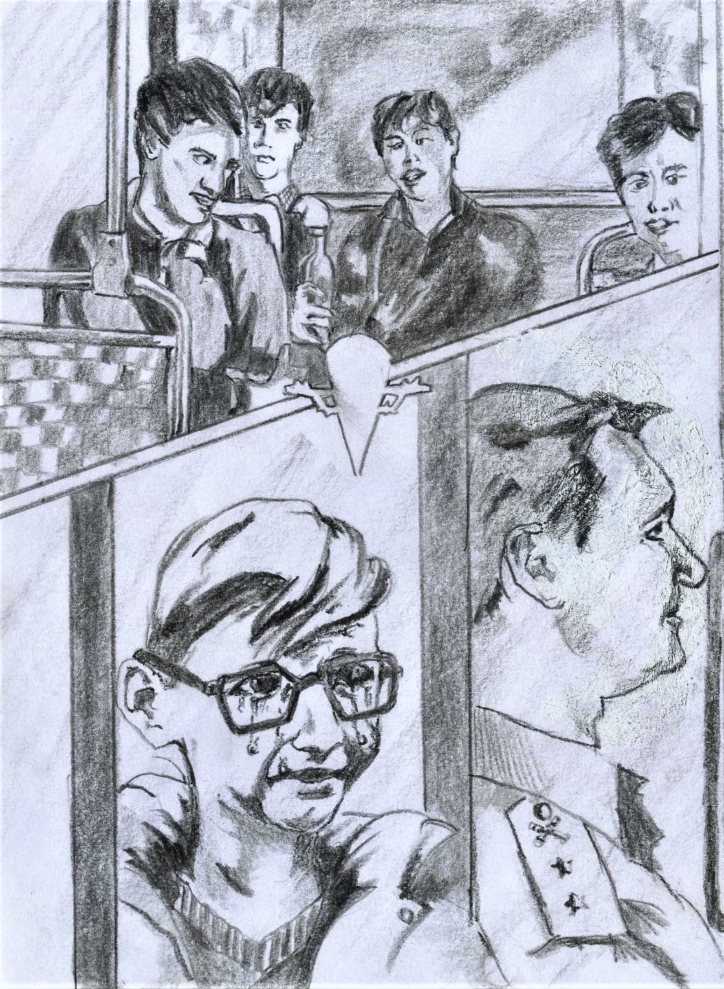 Благодаря умению призывников и напористой смекалке провожающих в нашем автобусе оказалось несколько бутылок вина и водки, что тут же разделило коллектив на неравные части. Инициативные, не гнушаясь знакомством, быстро сгруппировались на задних сидениях, оттеснив испуганных молчунов к середине и на передок.