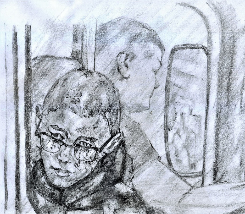 У него затряслась нижняя губа, очки вспотели, он всем телом повернулся в сторону прапорщика, но с той стороны на него осуждающе смотрели Вторые. Их взгляда он не перенёс, и, чтобы хоть как‑то стереть себя из этой сцены, обмяк, ссутулился и уткнулся в окно лбом. Он молча заплакал, выдувая на стекло пар, который проступил росой вокруг его головы, и в нашем обществе появился Третий.
