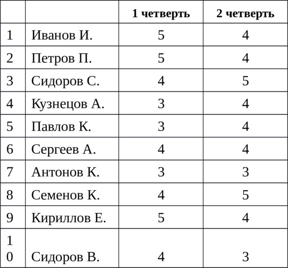 Например, дана таблица успеваемости учащихся за 1 четверть: