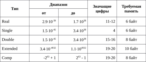 В зависимости от значения, вещественные числа можно описывать и с помощью других типов, приведенных в таблице.