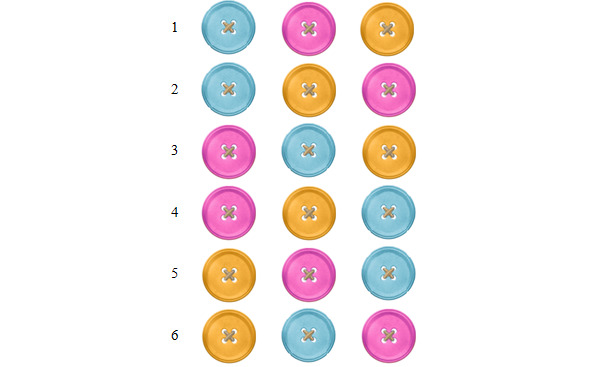 В первый ряд положим 3 пуговицы разного цвета. Мы уже считали, что возможных перестановок для трех элементов равно шести.