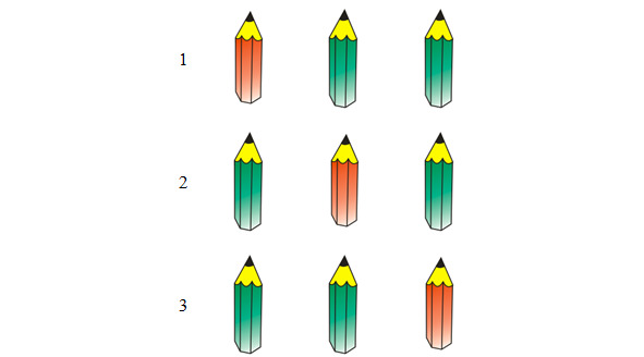Карандашей всего 3, значит, число перестановок равно 6. Но нет разницы, если поменять зеленые карандаши местами. Мы получим тот же самый вариант. Поэтому число перестановок с повторением будет всего 3: