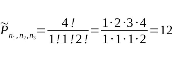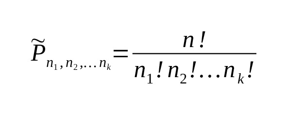– Да. Пусть множество состоит из n1 элементов одного вида, n2 элементов другого вида и т. д. Всего элементов n1+n2+…+nk=n. Тогда число перестановок с повторением равно.