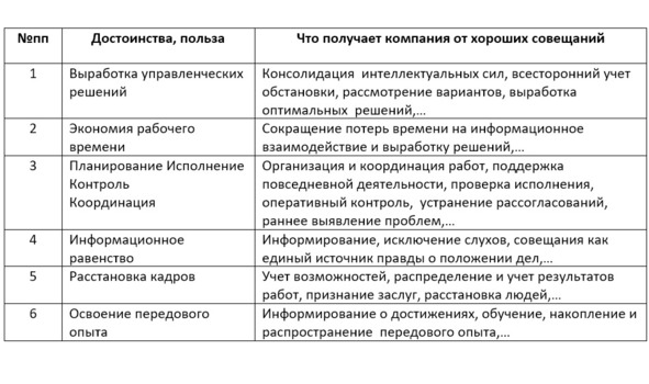Примеры полезных качеств, достоинств и пользы совещаний приводятся ниже.