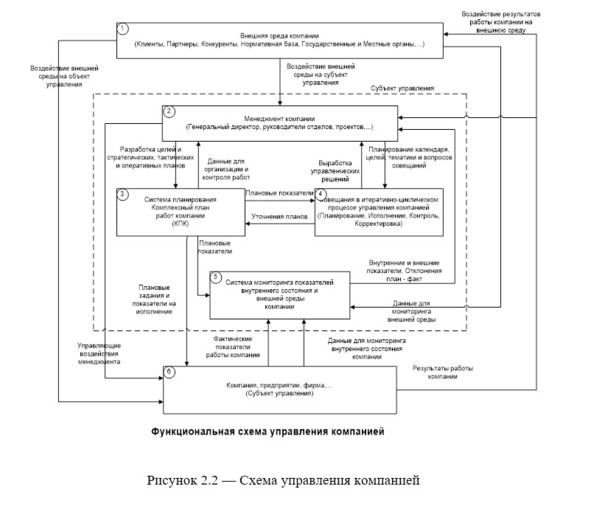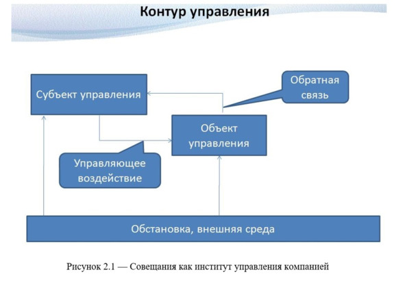 Данная функциональная структура эквивалентна широко известным в теории управления схемам, построенным с использованием прямых и обратных связей. С технической точки зрения, совещания находятся в центре этой схемы, являются компонентой субъекта управления и включены в контур управления, поскольку находятся в цепи обратной связи, образованной через посредство системы мониторинга объекта управления (предприятия) и внешнего окружения компании.