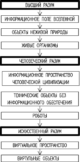 Используя известные научные данные, религиозное представление о сотворении мира, ветхозаветную антропологию и применив принцип аналогий, мы попытались ответить на вопрос, который для науки оказался неразрешимым, – откуда всё произошло. Наши представления об эволюции Вселенной с позиций информационной гипотезы показаны на рис. 1.