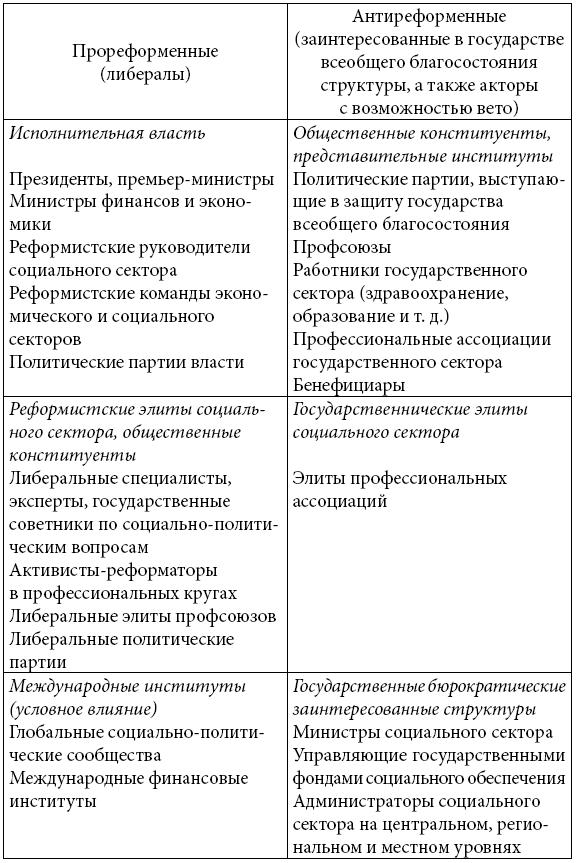 В посткоммунистических государствах инициативы по реформированию социального государства исходили в первую очередь от руководителей. Приверженные программам макроэкономической стабилизации руководители, столкнувшись с резкими экономическими спадами и фискальными кризисами, стремились сократить государственные обязательства и расходы на обеспечение всеобщего благосостояния и сделать их более эффективными. Президенты, министерства финансов и экономического развития, а также реформистские технократические группы выступали за либерализацию и приватизацию унаследованных государств всеобщего благосостояния. Их поддерживали представители реформистских социально-политических элит, которые формулировали программы рационализации и модернизации государства всеобщего благосостояния и назначались на должности руководителей министерств социального сектора, центров и аналитических институтов по вопросам проведения реформ. Пролиберализационные политические партии в посткоммунистических законодательных органах, особенно пропрезидентские партии власти, также имели существенный вес в прореформенном политическом балансе.