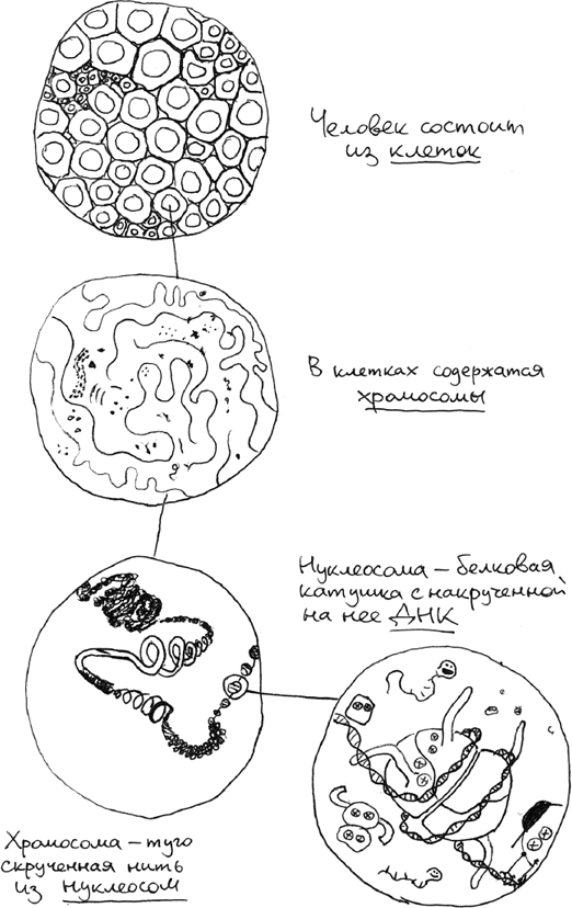 Допустим, ваш диаметр соответствует человеческому росту. В таких координатах средний белок будет размером эдак со Спасскую башню или статую Свободы, а рибосома – машина для изготовления белков – примерно с футбольный стадион. Матричная РНК – программа, которая в эту машину вставляется, – окажется лентой шириной в 20 метров, а длиной в десятки километров. ДНК – две похожие ленты, закрученные друг вокруг друга, но ленты настолько длинные, что это, скорее, дороги, ведущие из ниоткуда в никуда. У бактерий ДНК замкнута в огромное кольцо окружностью в половину, а иногда и весь земной экватор. У человека ДНК не кольцевая, поэтому начало и конец у нее все-таки есть, зато длина человеческой ДНК во много раз больше бактериальной. В наших воображаемых координатах расстояние между двумя концами ДНК в человеческой хромосоме – порядка расстояния от Земли до Луны. Оно и в обычных, реальных-то координатах впечатляет. Каждая хромосома – это одна молекула ДНК, намотанная на плотно упакованные катушки из белков-гистонов, а всего хромосом в каждой клетке 46 штук. Если хромосомы размотать, то в каждой клетке человека обнаружится аж два метра ДНК3.