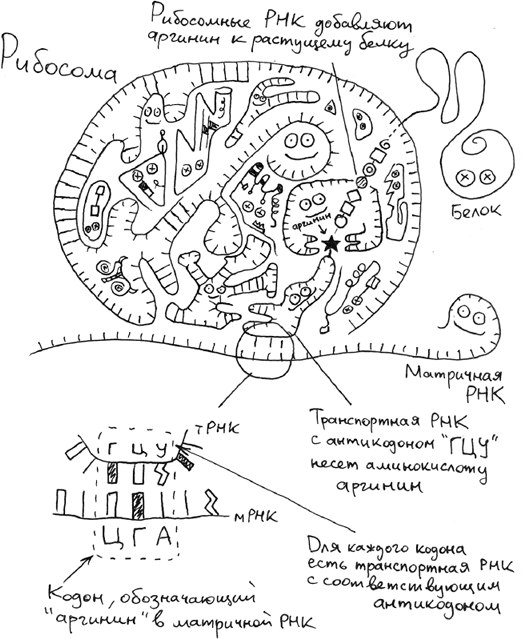 РНК-полимераза (белок, который «распечатывает» гены в РНК) и рибосома (машина, которая «переводит» РНК в белок) в совокупности делают принципиально важную вещь: они придают информации форму. Ген – абстрактная идея, записанная в последовательности нуклеотидов, – никак не влияет на мир до тех пор, пока не обретет физическое тело, отдельное от бесконечного рулона ДНК. Транскрипция дает ему материальную жизнь в форме РНК; трансляция в белок дает ему способность управлять внешним миром. Именно свойствами белков определяются свойства живого организма. Белки решают, как работает пищеварение. Белки решают, какой формы нос. Белки решают, с какой скоростью двигается по мозгу нервный импульс.