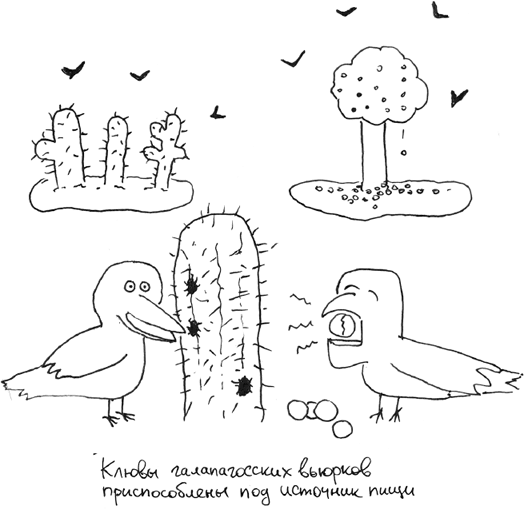 Вьюрков на Галапагосских островах почему-то было очень много, больше, чем других птиц. Но самое интересное даже не в их количестве, а в том, что на каждом острове вьюрки слегка отличались, особенно формой клюва. Одни клювы лучше подходили под ловлю насекомых, другие – под растительную диету. Если же на одном острове встречалось несколько разных клювов, то они различались очень сильно. Например, один клюв большой и раскалывает орехи, а другой – тонкий и клюет кактусы.