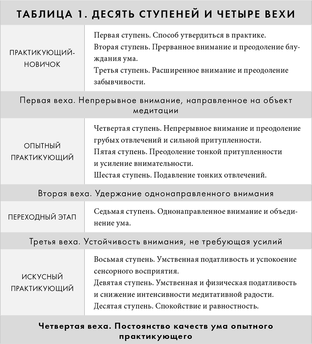 В ХОДЕ ТРЕНИРОВКИ ума мы проходим десять ступеней. Каждая из них имеет четкие характеристики, трудности и конкретные методы, необходимые для их преодоления. Ступени означают постепенное развитие ваших способностей. По мере вашего прогресса в практике вы также придете к четырем достижениям-вехам, которые делят десять ступеней на четыре группы. Это особенно важные этапы в вашей практике, когда освоение определенных навыков выводит медитацию на совершенно новый уровень.