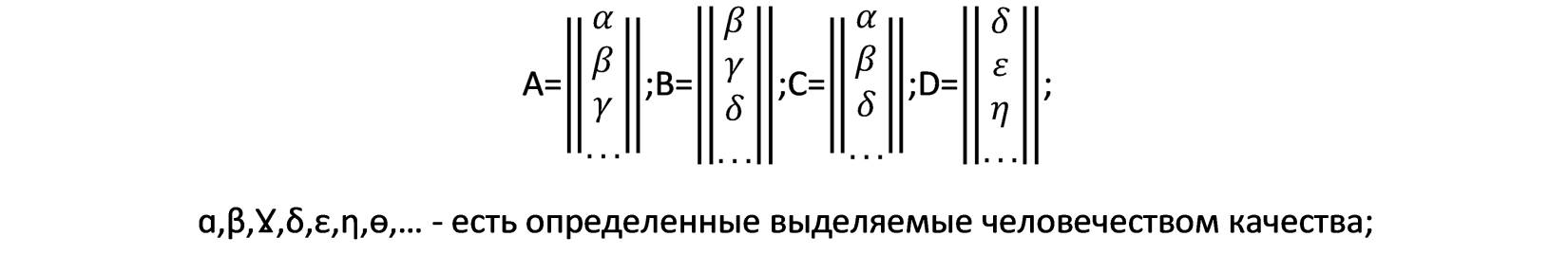 Пусть некоторые материальные объекты A,B,C,D имеют различную совокупность выделяемых человечеством качеств (физических или биологических):