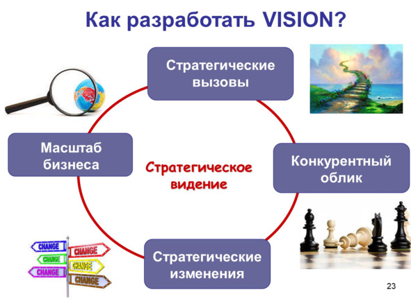 Как разработать VISION? Очень просто. Для этого надо ответить всего на один главный вопрос: какой мы желаем видеть свою компанию через 8-10-15 лет? Горизонт такого видения можно выбирать исходя из размеров компании, масштабов бизнеса, динамики рынка, амбиций собственников и топ-менеджеров.