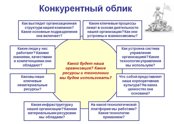 В разделе «Конкурентный облик» мы описываем видение организации «изнутри», ее строение, процессы, ресурсы, технологии (рис. 26):