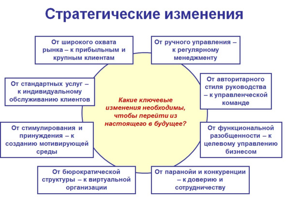 В разделе «Стратегические изменения» могут быть описаны ключевые направления изменений, необходимые, по нашему мнению, для реализации видения и преобразования компании (рис. 27).