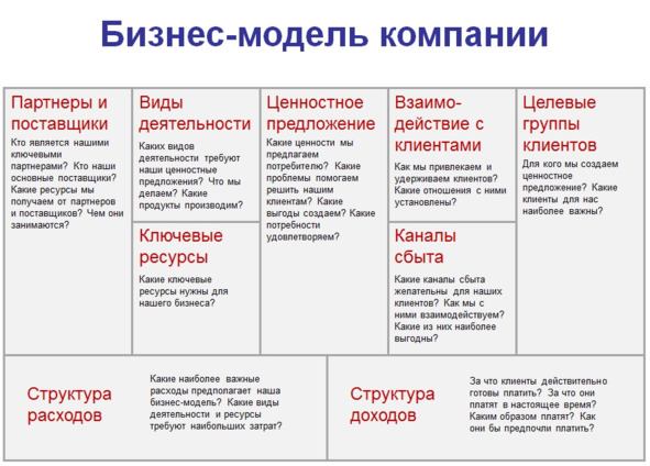 Это лучше делать в управленческой команде, привлекая к обсуждению всех ключевых руководителей и специалистов компании. Данный шаблон был впервые предложен в известной книге А. Остервальдера и И. Пинье «Построение бизнес-моделей»2, и он действительно служит весьма удобным инструментом для сбора и отображения идей участников обсуждения. С помощью этого шаблона возможно не только описание существующей бизнес-модели, но и ее оптимизация и даже создание принципиально новых, инновационных бизнес-моделей, так как шаблон позволяет увидеть модель бизнеса как бы с «высоты птичьего полета» и обнаружить интересные и скрытые возможности для его развития. Обычно использую его при работе со своими клиентами.