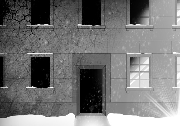 Они повернули налево ещё два раза, и вышли к дому без двери. Окна на первых двух этажах были выбиты, и ничьих следов на свежем снегу рядом не было. Саша остановился и указал на дверь.