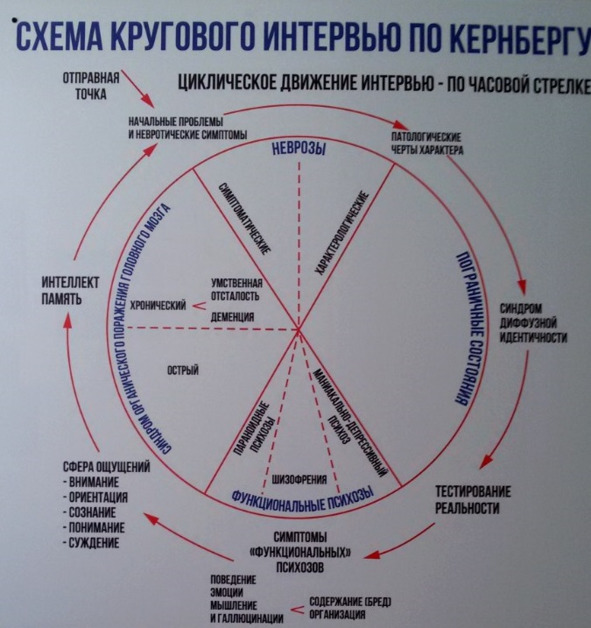 В отличие от психических расстройств, которыми занимается «большая психиатрия», при «пограничной патологии» вряд ли будут наблюдаться расстройства мышления, интеллектуальной сферы или другие выраженные психопатологические отклонения. Если такие проявления имеют место и исследователь испытывает затруднения при их верификации, то следует использовать такой диагностический инструментарий, как структурное интервью Кернберга (рис.3), провести тщательное психопатологическое исследование.