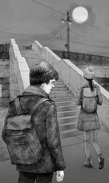 Было уже довольно поздно и темно. Фонари тревожно освещали пространство, как бывает, когда на город ложится промозглый осенний туман. Федя прошла мимо поворота на Жуковского. Сейчас все мысли как будто оставили ее, а неведомая сила влекла вперед. Ей ничего не хотелось, и она почти ничего не чувствовала, кроме желания идти. Впереди показался Литейный мост, над которым висела полная луна, окруженная ярко-синим мерцающим ореолом, и оттуда, с неба, опускался серебристый туман. Федя прибавила шагу.