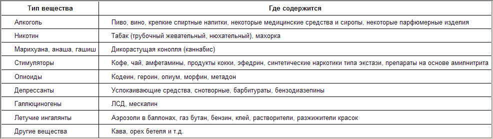 К ним относятся никотин (табак, сигареты, папиросы, сигары), алкоголь (все напитки, содержащие этиловый спирт), кофеин (крепкий кофе, чай).