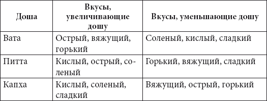 Посмотрите, пожалуйста, на таблицу, в которой мы расположили вкусы в порядке возрастания их способности увеличивать или уменьшать ту или иную дошу.