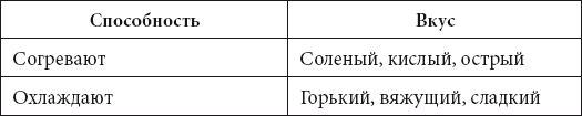 Каждый из шести вкусов также обладает способностью согревать или охлаждать. Так, острый, кислый и соленый – согревают; сладкий, вяжущий и горький – охлаждают. В таблице они выстроены в последовательности от менее согревающих к более: