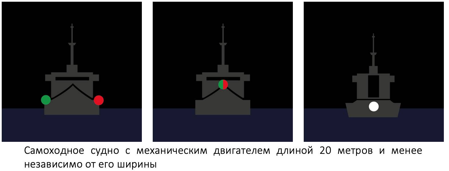 Самоходное судно с механическим двигателем длиной 20 метров и менее независимо от его ширины несет один кормовой огонь, а бортовые огни такого судна могут быть скомбинированы в фонаре.